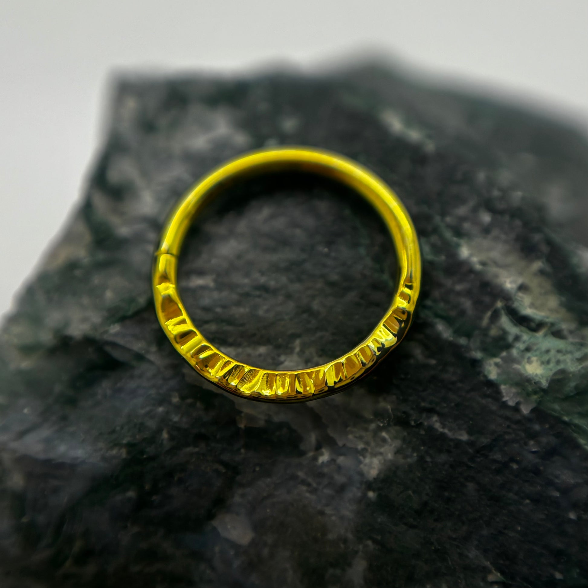 These stunning textured niobium seam rings are the perfect blend of durability and style. With a size of 16g and a 5/16" (8mm) diameter, they’re ideal for daith and helix piercings, and can work beautifully for some septum piercings—though we always recommend a size check with your professional piercer before committing.